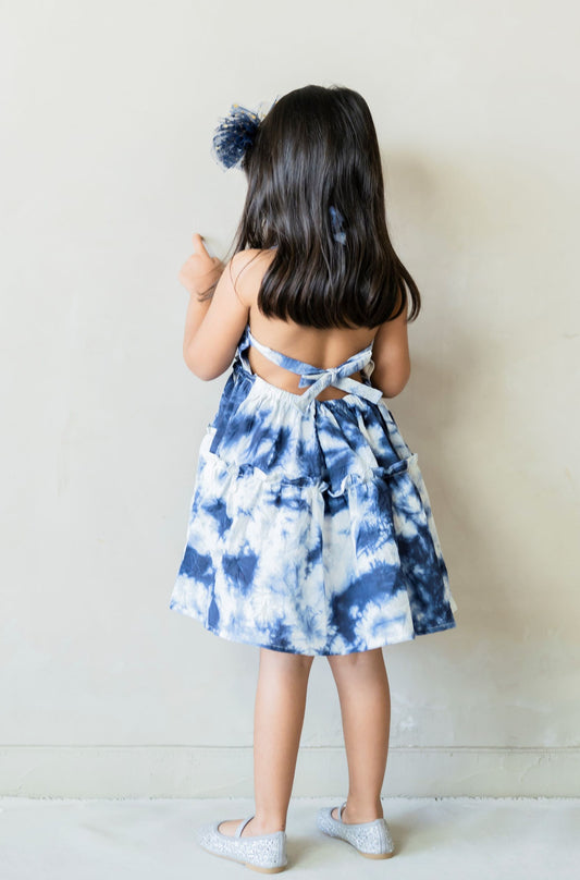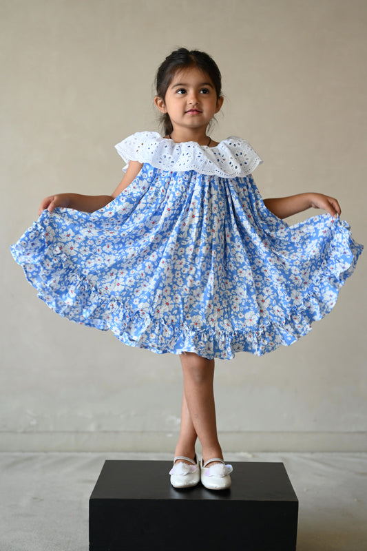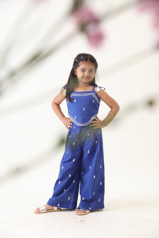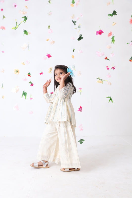 Girls Blue Cotton-Lurex Overcoat With Silver Lurex Stripe Top & Palazzo