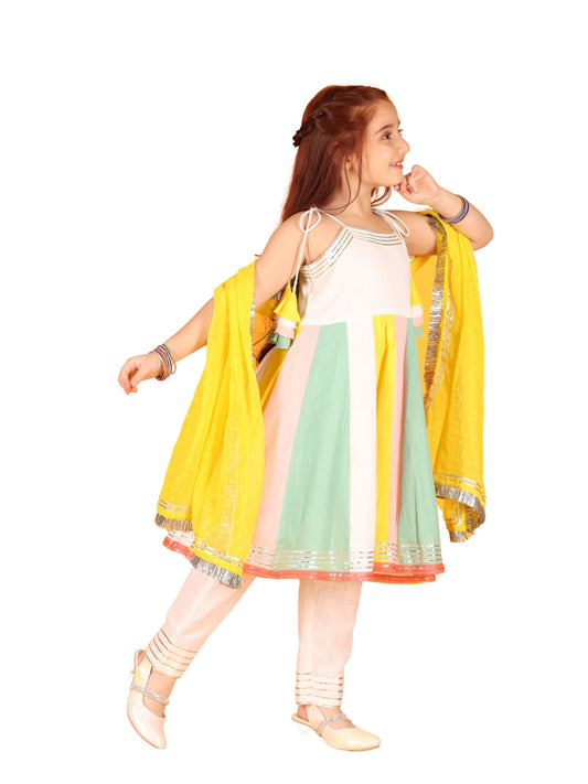 Jilmil Girls White Multicolor Cotton Dress with pant & Dupatta (set of 3)