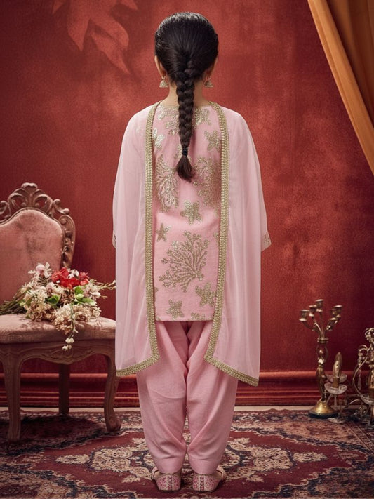 Girls Light Pink Cotton Salwar Kurti with Dupatta (Set of 3)