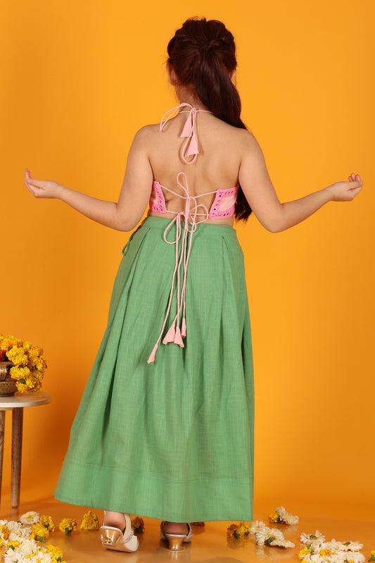 Jilmil Girls Mirror emblished Baby Pink Top with Green cotton Lehenga (set of 2)