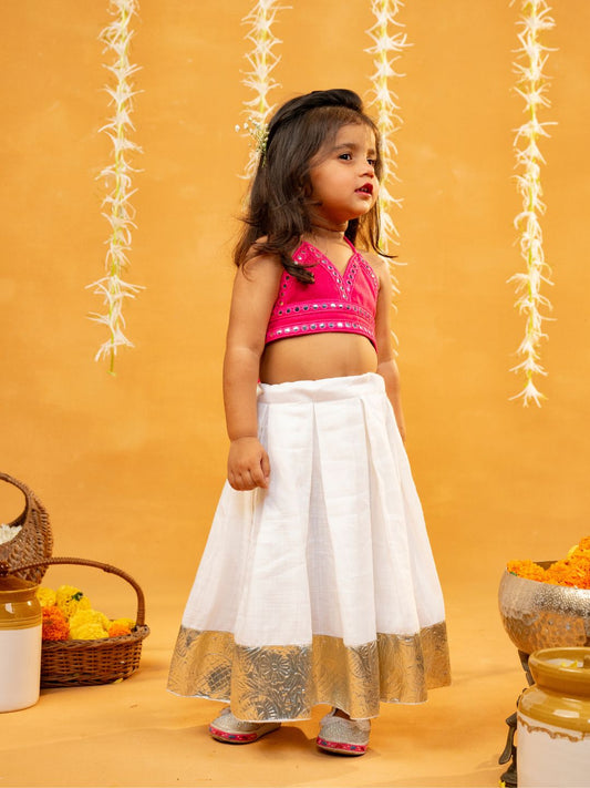 Jilmil Girls Mirror emblished Rani Pink top with White cotton Lehenga (set of 2)