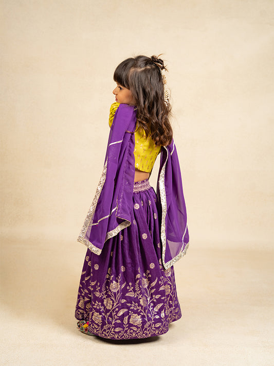 Girls Mehendi Colour Puff Sleeve Top and Purple Lehenga with Dupatta (Set of 3)