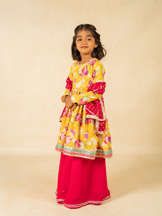 Girls Yellow Anarkali Top and Palazzo with Dupatta (Set of 3)